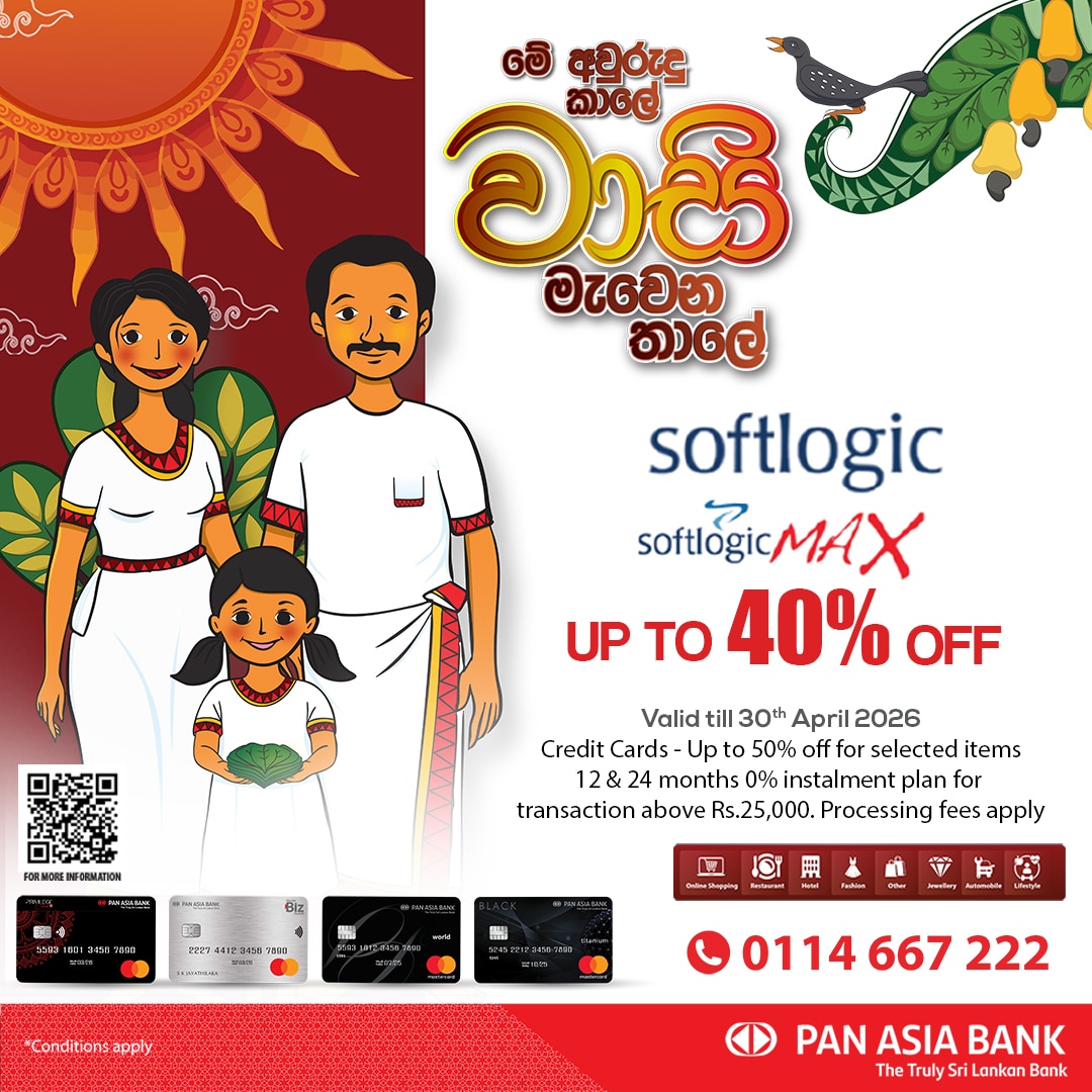Celebrate the season with Pan Asia Bank—enjoy up to 40% off on consumer electronics and furniture along with 12 & 24 months 0% installment plans using your Pan Asia Bank Credit Cards, valid till 30th April 2026. T&Cs apply.