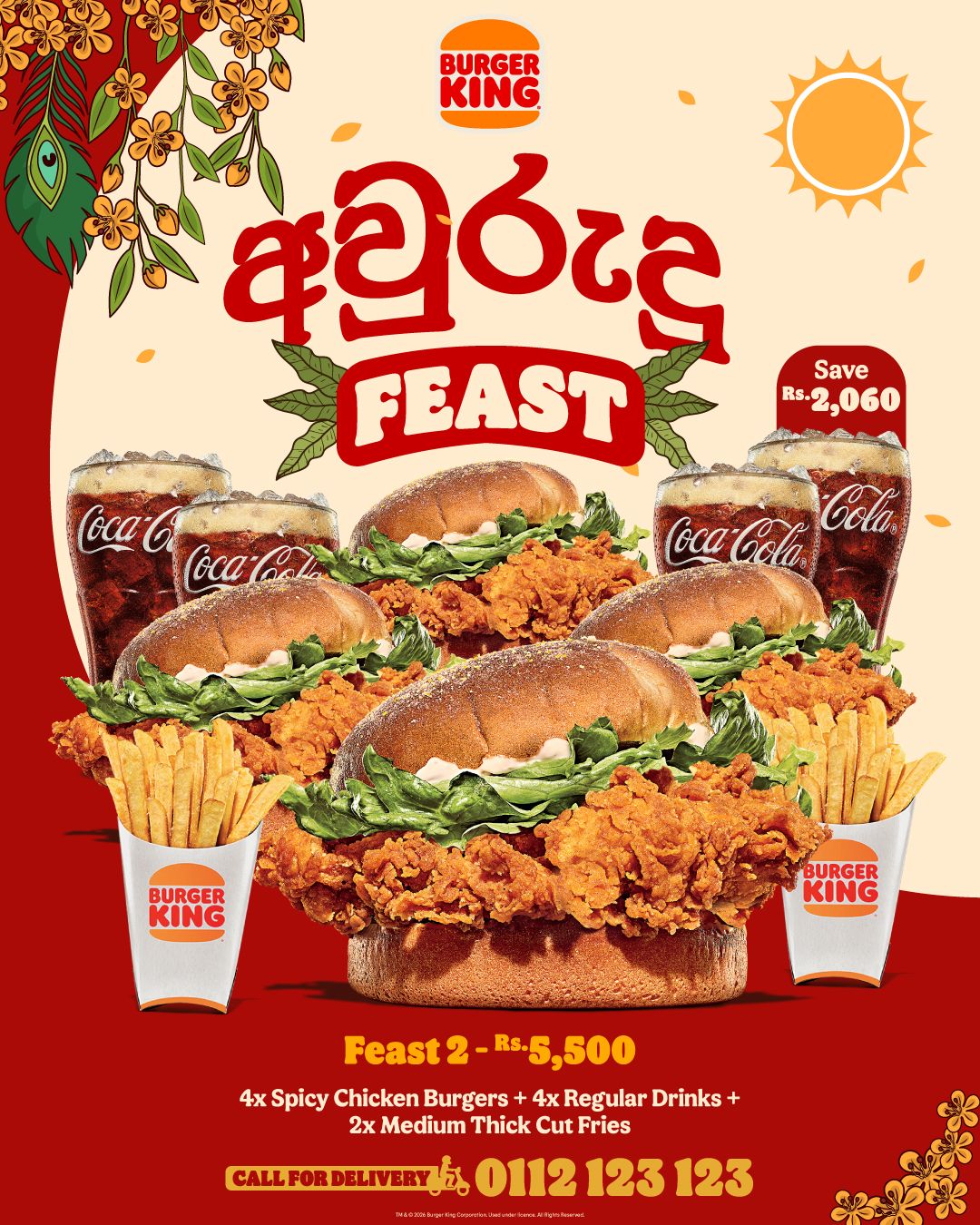 Enjoy a delicious seasonal combo with the Feast 2 offer from Burger King Sri Lanka, priced at just Rs. 5,500. This value-packed meal includes 4 crispy Spicy Chicken Burgers, 4 refreshing regular drinks, and 2 portions of medium thick-cut fries—perfect for sharing with family or friends. Designed for bigger gatherings and satisfying cravings, this combo delivers bold flavors and great savings, making it an ideal choice for festive moments, casual hangouts, or weekend treats. Big on taste and value, Feast 2 brings everyone together for a truly enjoyable dining experience